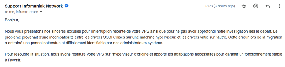 Malgré nos efforts et ceux de nos partenaires techniques, Infomaniak a initialement affirmé que le problème venait de notre côté. Après plusieurs essais infructueux, nous avons décidé de restaurer notre service à partir d’un backup chez un autre fournisseur.